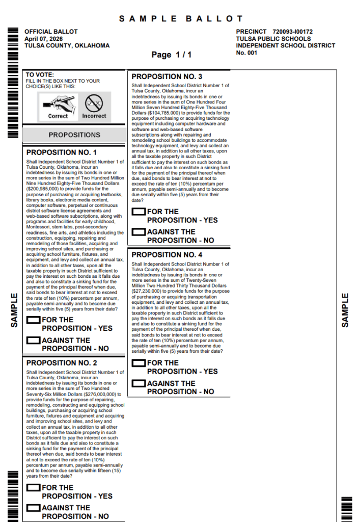 - Tulsans have four items to vote on Tuesday, April 7, that fund four propositions for Tulsa Public Schools.